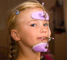 Often referred to as reverse-pull headgear, the protraction face mask is a removable appliance for patients where the upper jaw is not growing fast enough, resulting in a crossbite or underbite. The device consists of a metal bar attached to pads on the forehead and chin with rubber bands hooked to the face mask and the upper braces to gradually move the upper jaw forward. Patient compliance is extremely important as the face mask must be worn a set number of hours per day or more to obtain the desired results. The face mask device is generally worn for six to 12 months.